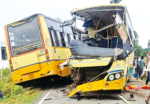 தென்காசி மாவட்டம் கடையநல்லூர் அருகே கடந்த மாதம் (நவம்பர்) 24-ந் தேதி 2 தனியார் பஸ்கள் நேருக்கு நேர் மோதிக்கொண்டதில் 7 பயணிகள் உடல் நசுங்கி இறந்தனர். இந்த விபத்தை தொடர்ந்து நேற்று காரைக்குடி அருகே 2 அரசு பஸ்கள் நேருக்கு நேர் மோதிய கோர விபத்து நடந்துள்ளது.