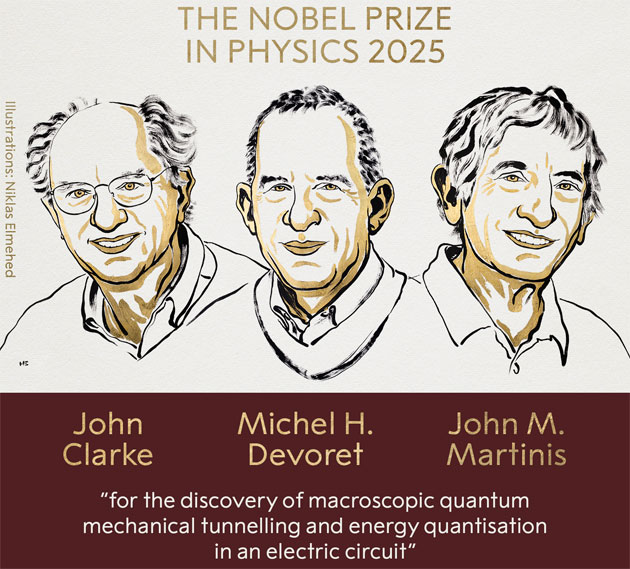 2025ஆம் ஆண்டின் இயற்பியலுக்கான நோபல் பரிசு, அமெரிக்காவைச் சேர்ந்த மூன்று விஞ்ஞானிகளுக்கு பகிர்ந்தளிக்கப்படுகிறது.
